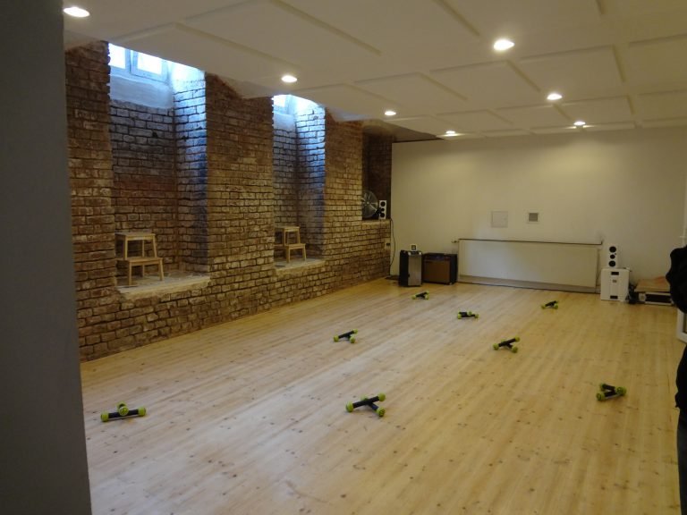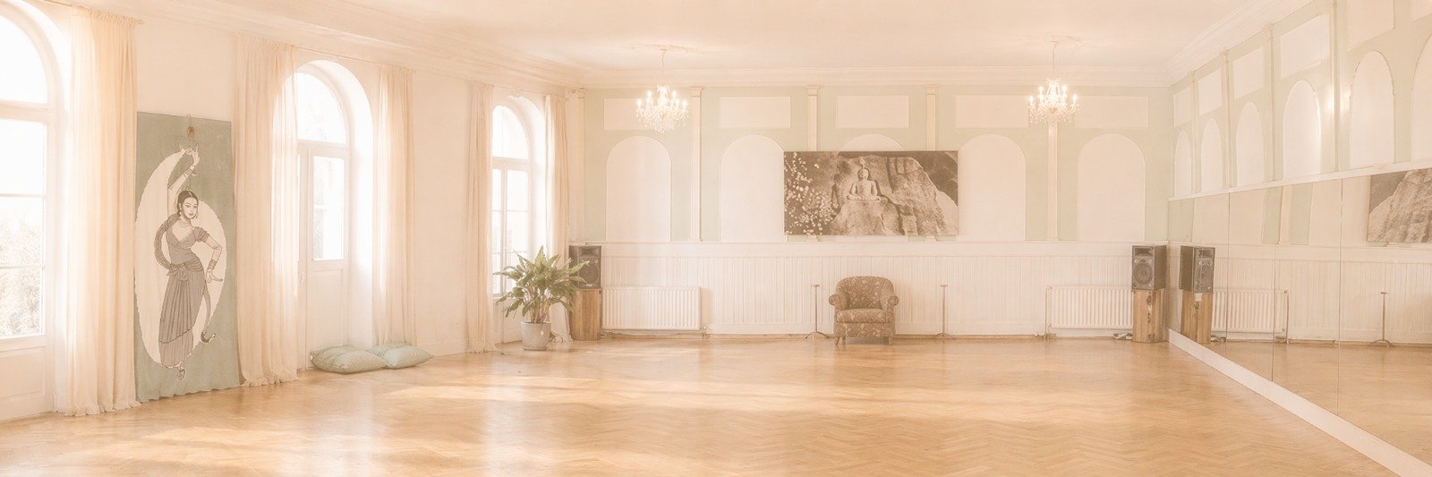 Unser Hauptsaal erstreckt sich über 120 m² und ist nahezu quadratisch gestaltet. Er verfügt über eine 13 Meter lange, abdeckbare Spiegelwand, die ideal für Tanz- und Performance-Übungen ist. Der hochwertige Parkettboden und die 4,5 Meter hohen Schallschutzfenster, die zum ruhigen Innenhof ausgerichtet sind, schaffen eine perfekte Atmosphäre für konzentriertes Arbeiten und kreative Entfaltung.